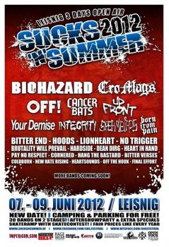 Zum bereits 10. Mal findet das Sucks N Summer Festival nun schon statt, folgendes LineUp konnte bisher bestätigt werden: SUICIDAL TENDENCIES, CALIBAN, NAPALM DEATH, CRO MAGS, DOG EAT DOG, BURY YOUR DEAD, VISION, STRIFE, MERAUDER, SWORN ENEMY, STICK TO YOUR GUNS, FIRST BLOOD, MISCONDUCT, BACKFIRE!, ALL FOR NOTHING, CEREMONY, THE CARRIER, NO TURNING BACK, FOR THE FALLEN DREAMS, FINAL PRAYER, TOUCHÉ AMORÉ, DEATH IS NOT GLAMOROUS, PUNISHABLE ACT, CRUSHING CASPARS, BETRAYAL, GROWING MOVEMENT, HITMAN, SCREWED UP, ALL TEETH, ONLY ATTITUDE COUNTS, AYS, LA DISPUTE, WISH FOR WINGS, RIVALS!